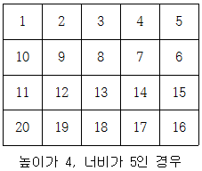 숫자의 진행 순서는 처음에 왼쪽에서 오른쪽으로 너비 m만큼 진행 한 후 방향을 바꾸어서 이를 반복한다.